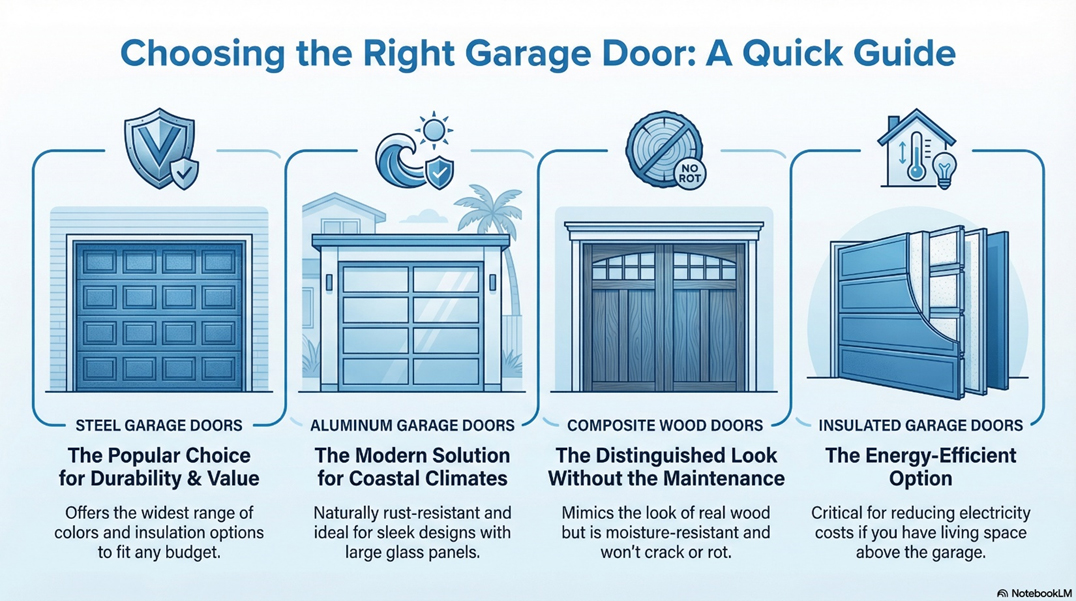 Garage doors can accommodate automobiles and other vehicles. Smaller garage doors can be a single panel that tilts up and back across the garage ceiling.